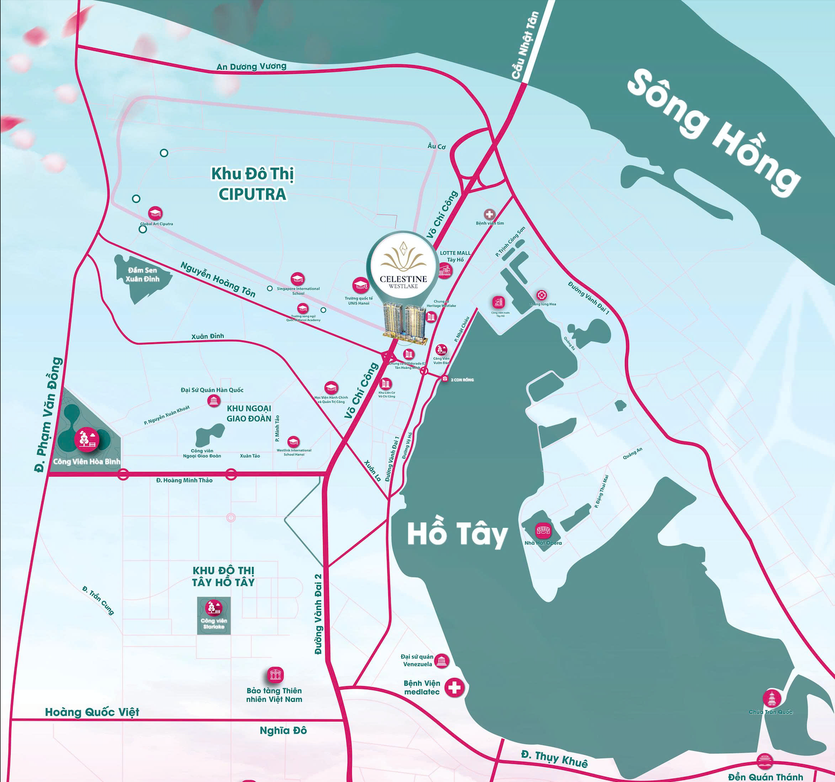 Nằm trên trục Võ Chí Công, Celestine Westlake nằm giữa mạng lưới kết nối linh hoạt các trục giao thông chính đến Ciputra, khu vực Ba Đình, Hoàn Kiếm cũ và sân bay Nội Bài. Sự hiện diện của nhiều tuyến đường hướng tâm giúp cư dân dự án rút ngắn thời gian di chuyển đến các điểm dịch vụ, thương mại và văn hóa trong khu vực.